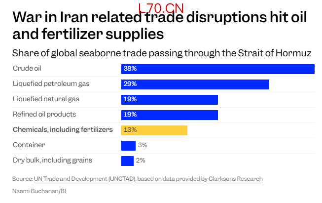 美国主要行业组织化肥研究所(Fertilizer Institute)解释说,全球近50%的尿素和硫磺,以及20%的天然气(氮肥的原料)都要经过霍尔木兹海峡。