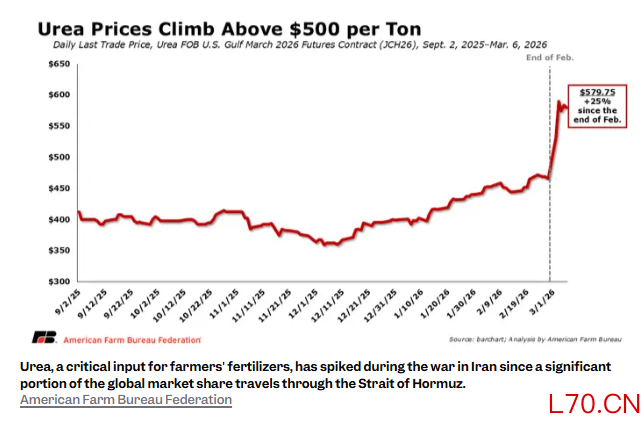 下图显示,自2月底战争爆发以来,尿素价格飙升。