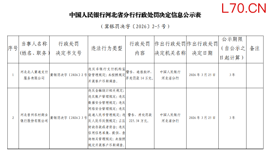 河北晋州农村商业银行被罚225.34万元:违反金融统计相关规定等