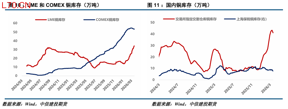 本周铜价走弱,沪铜主力自10万元下跌至9.3万元,最低触及91820元,周跌幅超7%。LME铜自1.3万美金回落至1.18万美金,周跌幅约7.4%。本周中东地缘发酵,加之美国2月PPI同环比涨幅超预期回升,市场押注美联储年内不再降息,衰退交易升温,施压铜价大幅回落。
