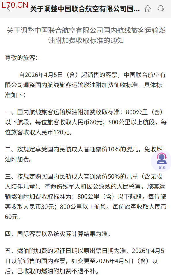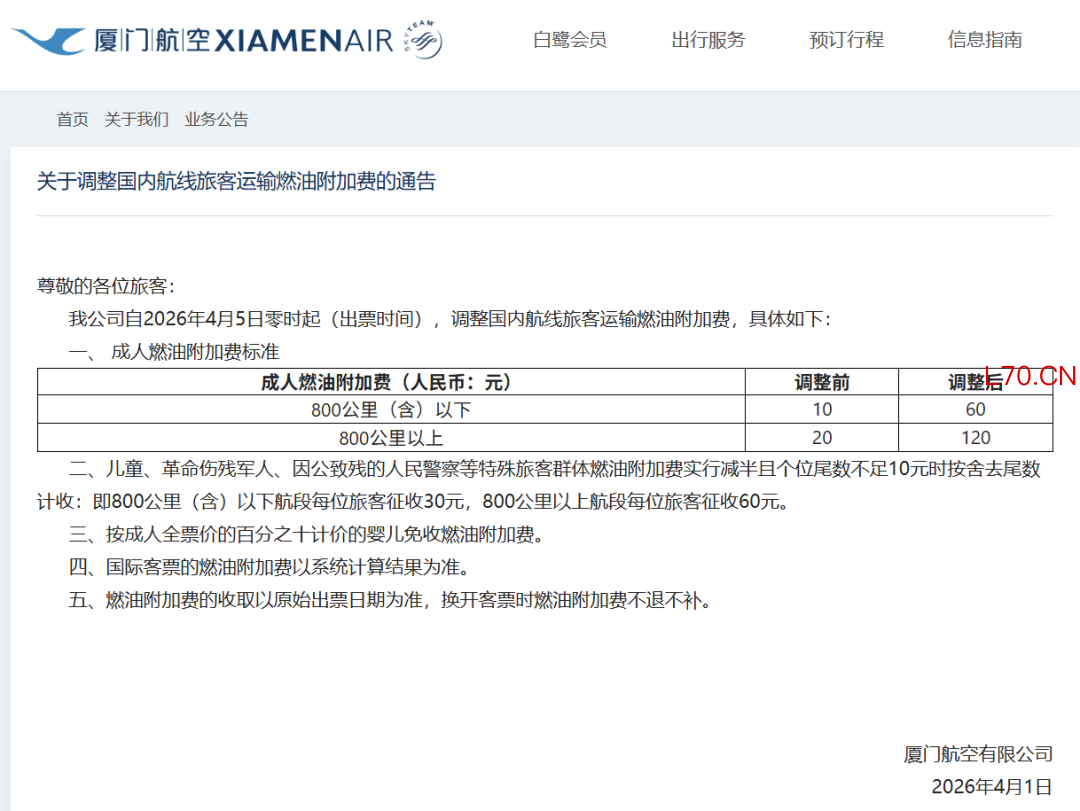 具体而言,厦门航空表示,将自2026年4月5日零时起(出票时间),调整国内航线旅客运输燃油附加费。其中,成人燃油附加费标准为:800公里(含)以下为60元;800公里以上为120元。