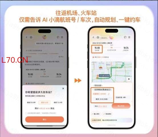 比如告诉小滴“我明天要乘高铁G21,帮我约一辆车”,小滴就会自动查询高铁出发时间和高铁站,根据用户希望提前抵达车站的时间、结合路况来推算叫车出发时间,自动为用户寻找后备箱大的车型,航班同样适用。
