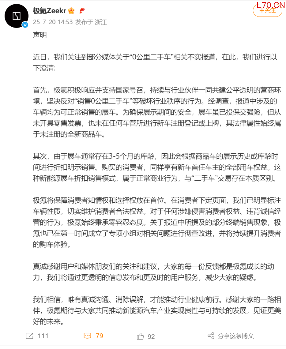 极氪否认销售“0公里二手车”