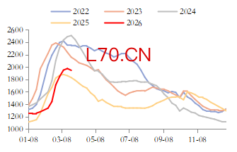 具体分行业来看,地产、基建和制造业投资增速均有所回升,除地产投资外,其余行业投资增速均转正。1-2月份商品房销售面积和销售额同比分别下降了13.5%和20.2%,降幅相比12月收窄了3.06和4.03个百分点。上海2.25新政之后,地产高频销售数据继续改善,截止3月22日当周,全国30个大中城市商品房销售面积208.84万平方米,连续两周环比回升。但供应端数据依然偏弱,新开工和竣工面积的跌幅仍在持续扩大,表明在销售回款压力较大的情况下,企业投资意愿依然偏弱,行业的重心仍以保交楼和存量去化为主。1-2月份地产资金来源分项中的定金及预收款和按揭贷款降幅相比2025年全年扩大5.3和21.4个百分点亦从侧面证明了这一结论。未来稳地产的政策仍将持续加码,一线城市在政策托底下已经出现企稳迹象,这种由点及面的传导效应能否扩散到跟多的二三线城市将是成为决定全年楼市走向的关键。预计2026年二季度地产行业经过底部盘整后,逐步止跌回稳概率较大。不过,地产政策依然是以去库存为主,对于建材消费的拉动作用预计有限。