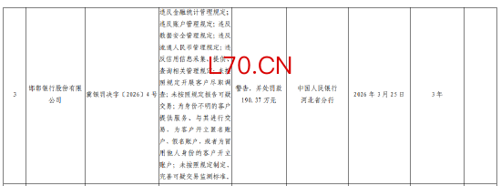 邯郸银行被罚190.37万元:违反金融统计管理规定等